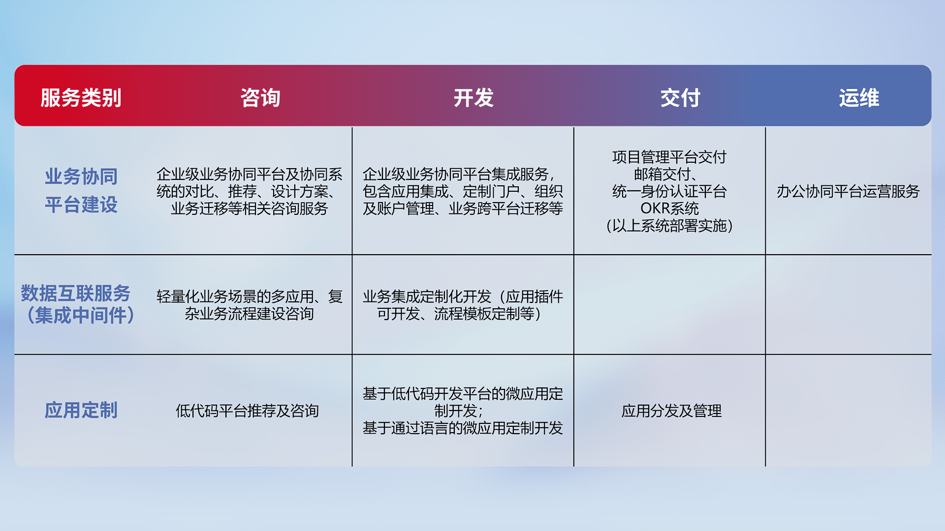 针对钉钉、、、企微、、、、IDaas等平台级产品提供产品的规划、、、、方案、、交付、、、定制化开发等服务,,,,实现如统一协同办公、、智能客户服务、、混合会议管理、、、、智能数据查询、、、等业务场景,,实现数字化转型。。