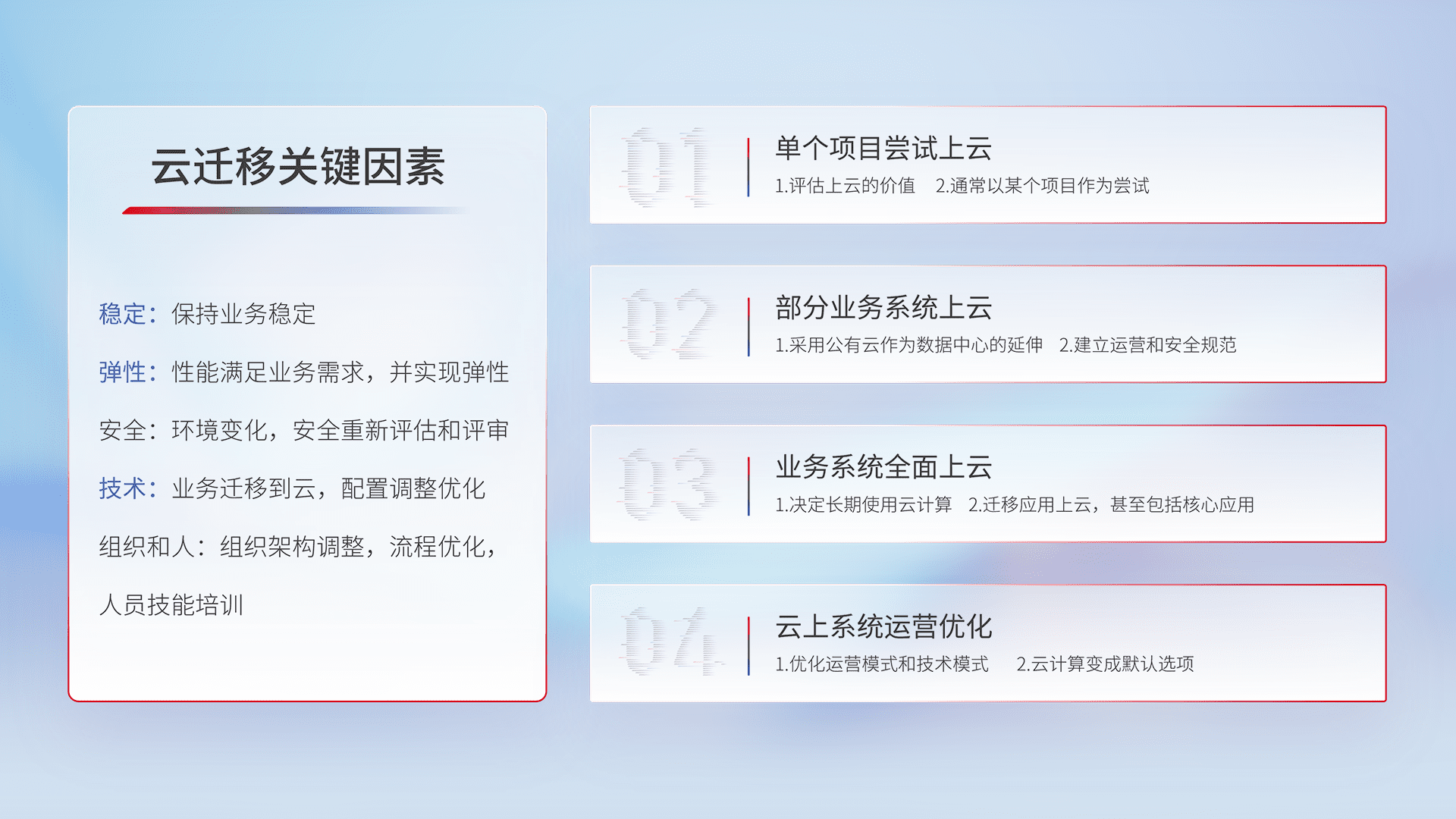 结合实际业务,,从规划设计、、、、云平台选型、、、云原生改造、、、、数据迁移、、、集成交付,,,,迁移全过程为客户识别最佳上云路径,,,做好风险识别管理,,设计网络架构、、、、身份权限、、、安全审计合规、、、操作审计、、、、日志审计、、、、监控告警策略、、、多站点容灾设计等,,对云上基础设施进行整体规划,,,提升IT治理水平,,,以满足弹性、、高可用、、、高性能的需求。。
