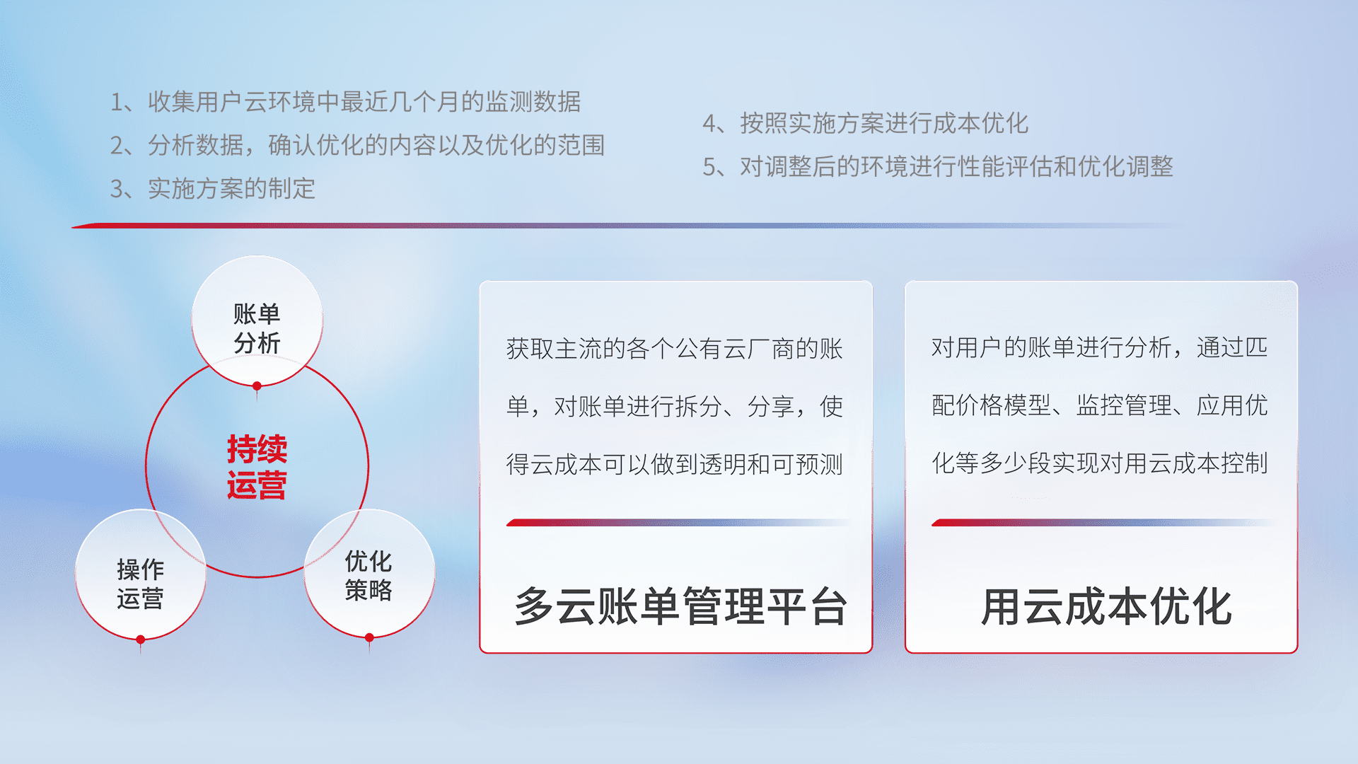 通过多云纳管,,,以统一的资源数据模型把客户的云资源进行抽象和封装,,,进而实现对多云资源的统一操作,,,,保障云资源管理的可靠性、、、稳定性与可用性。。。量身定制化运维内容,,配置、、开发运维、、、补丁管理、、、备份、、监控、、、、认证和访问管理、、、审计和日常巡检等,,,,保障在用云过程中的可靠度,,稳定度以及高可用率。。